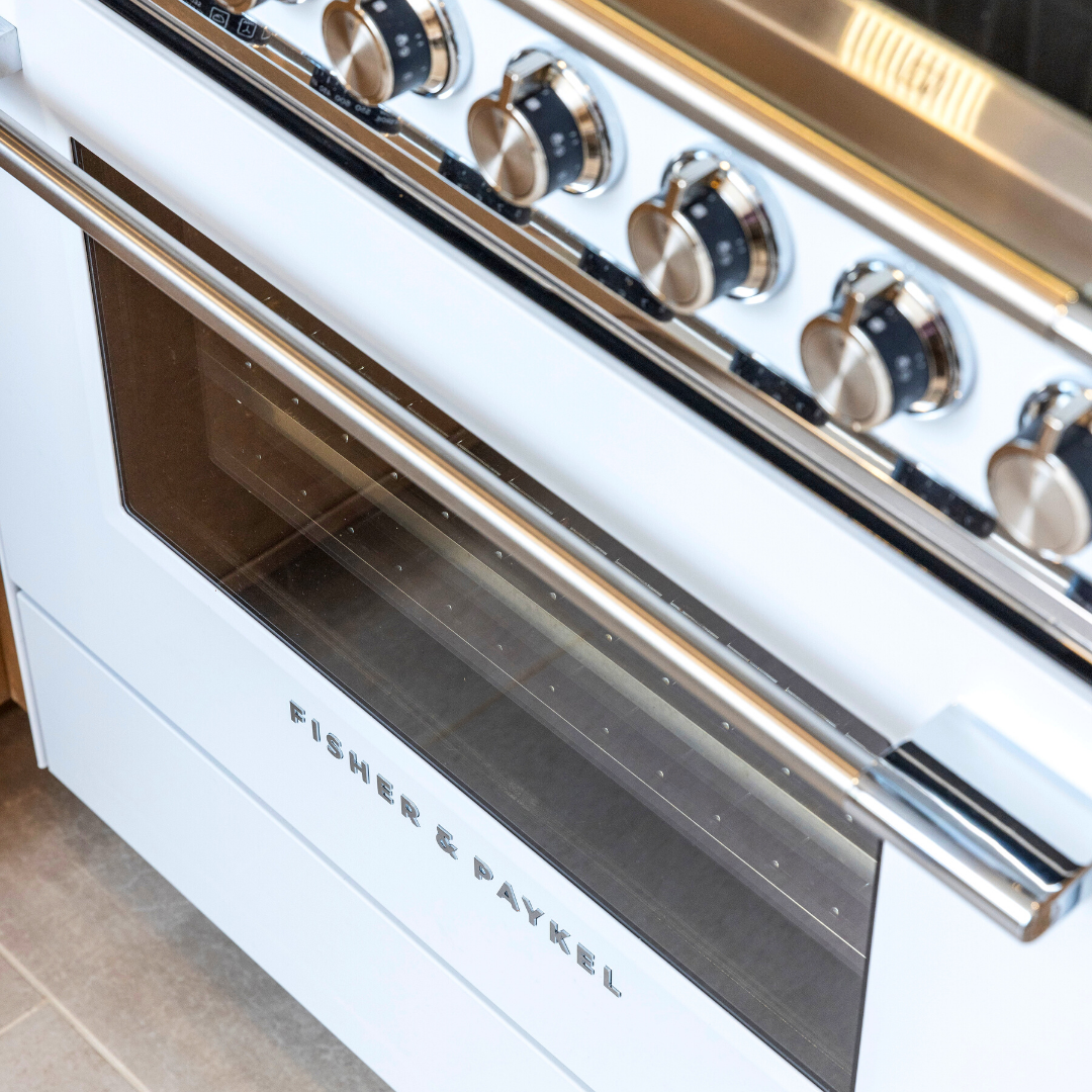 A sleek white stove — My client wanted white appliances, which are highly sought after as fewer appliances in this color are manufactured today. We knew this was a must as it would bring her a lot of joy in this space. (Brand: Fisher & Paykel)